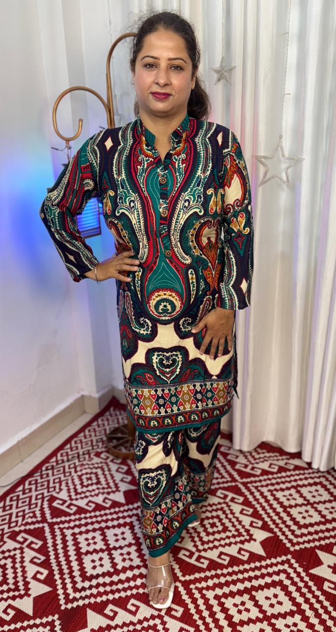Tradition meets trend in this vibrant coord set designed for effortless style. Made from soft, breathable reyon, it flows with grace and feels feather-light on the skin. The bold print adds a splash of personality, while the modern silhouette keeps it versatileโperfect for brunch dates, festive errands, or just vibing in comfort.