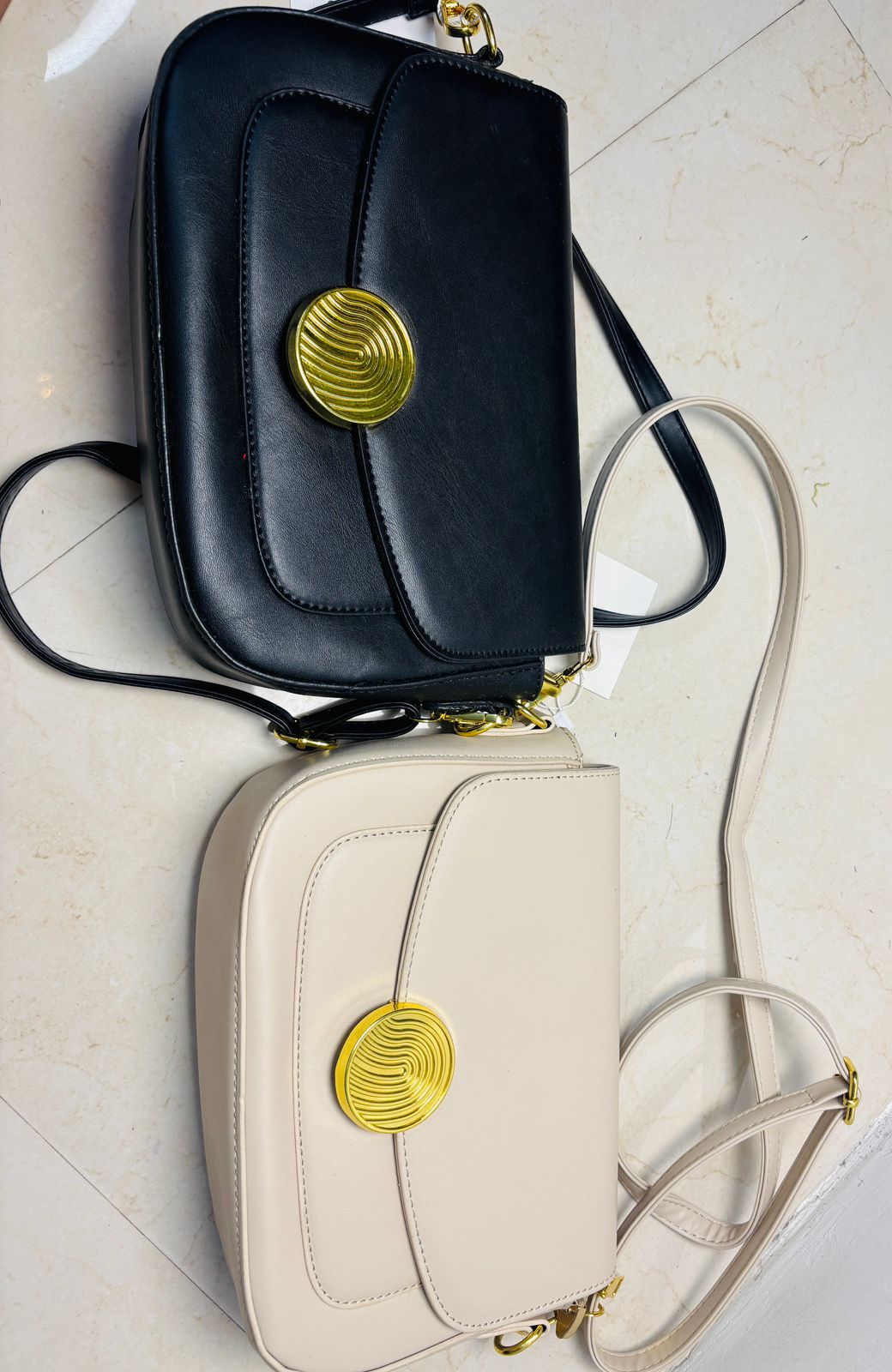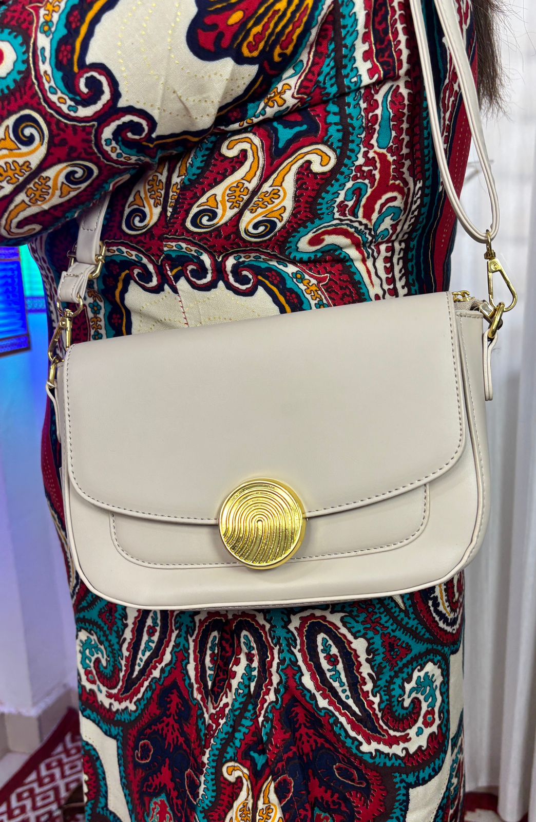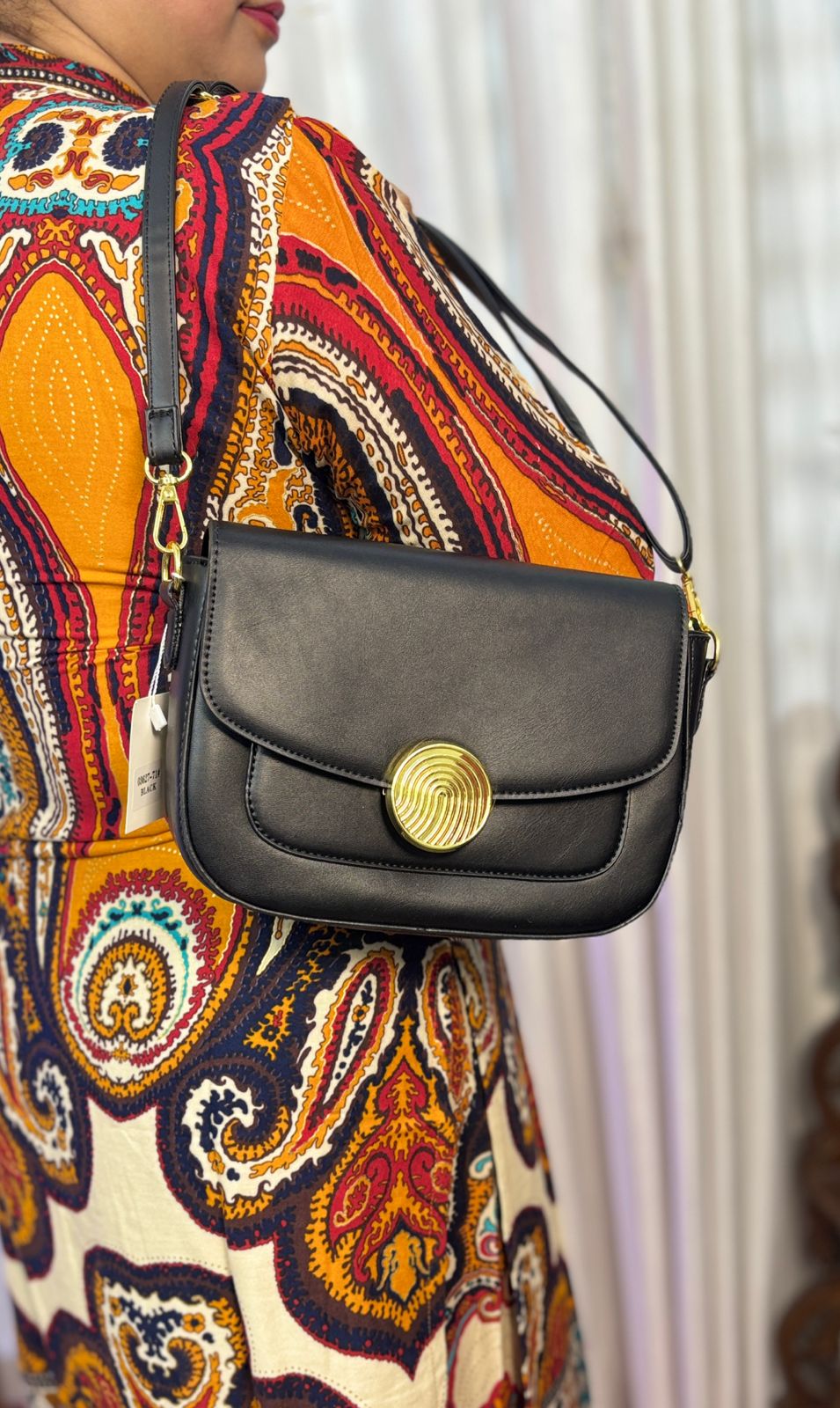- “Crafted for day-to-night elegance, this flap bag features a signature concentric gold accent that catches the light and compliments every silhouette.”