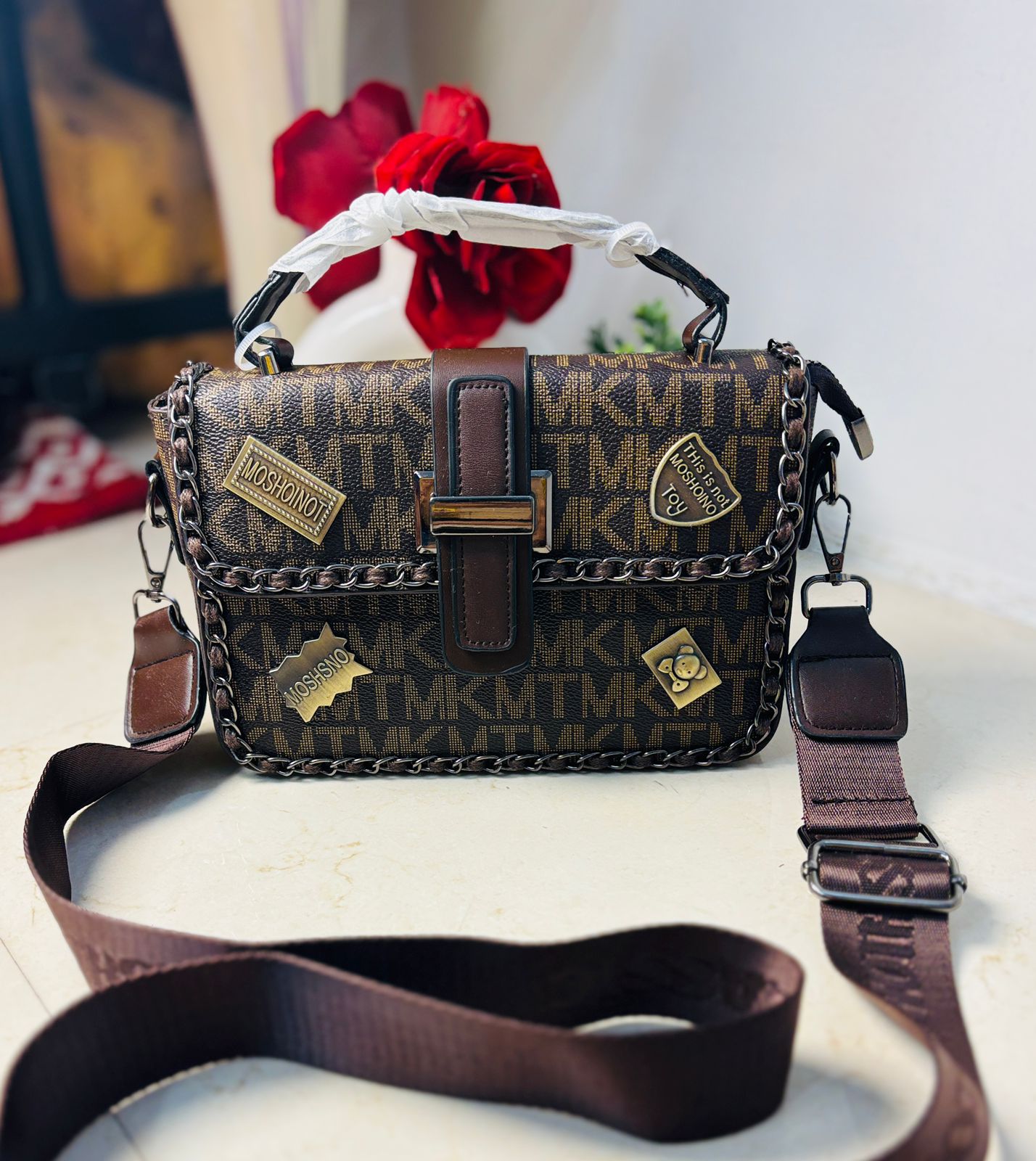 Crafted with premium printed canvas leatherette, these bags feature timeless designer-inspired patterns with chic metallic badges that add a touch of glamour. The elegant front buckle closure combined with a sleek chain-detail border gives the bag a high-fashion appeal.