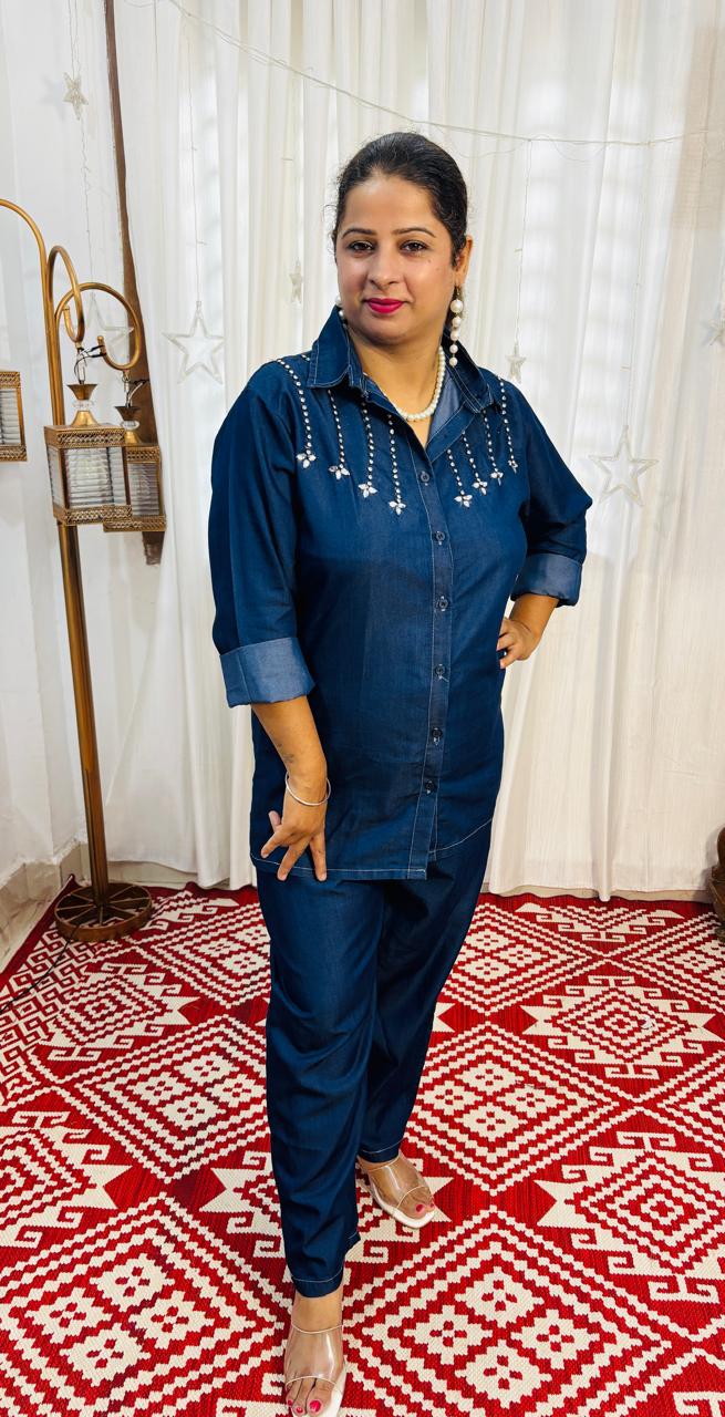 Step into the spotlight with this deep indigo denim ensemble, kissed with pearl constellations on the shoulders—where tradition meets trend. The structured silhouette flatters with quiet confidence, while the soft shimmer of embellishments adds a whisper of glamour. Paired with a classic tan mini handbag and set against a starlit curtain backdrop, this look is perfect for festive soirées, fashion showcases, or intimate celebrations.