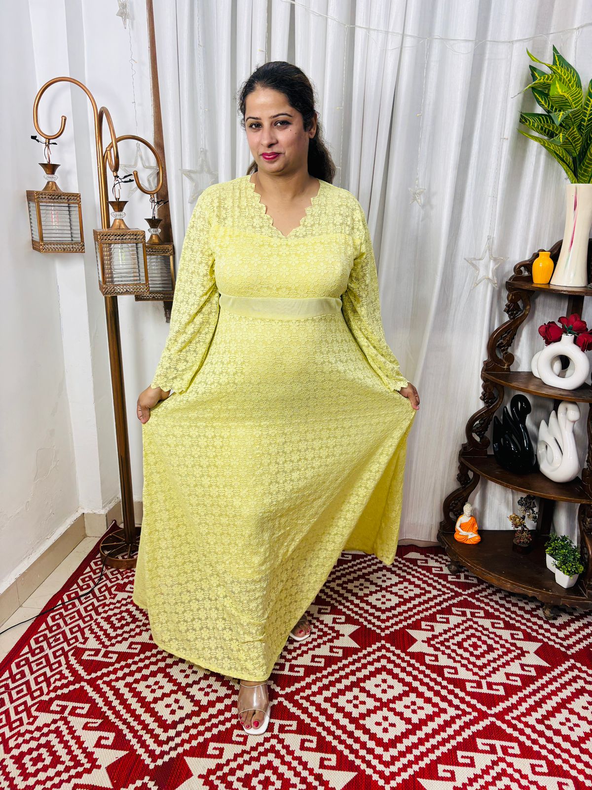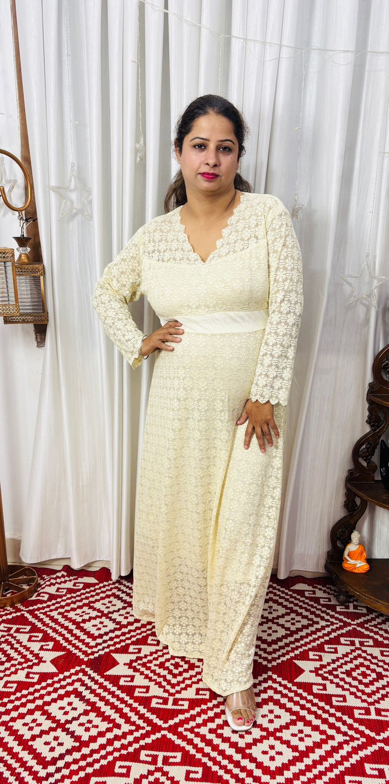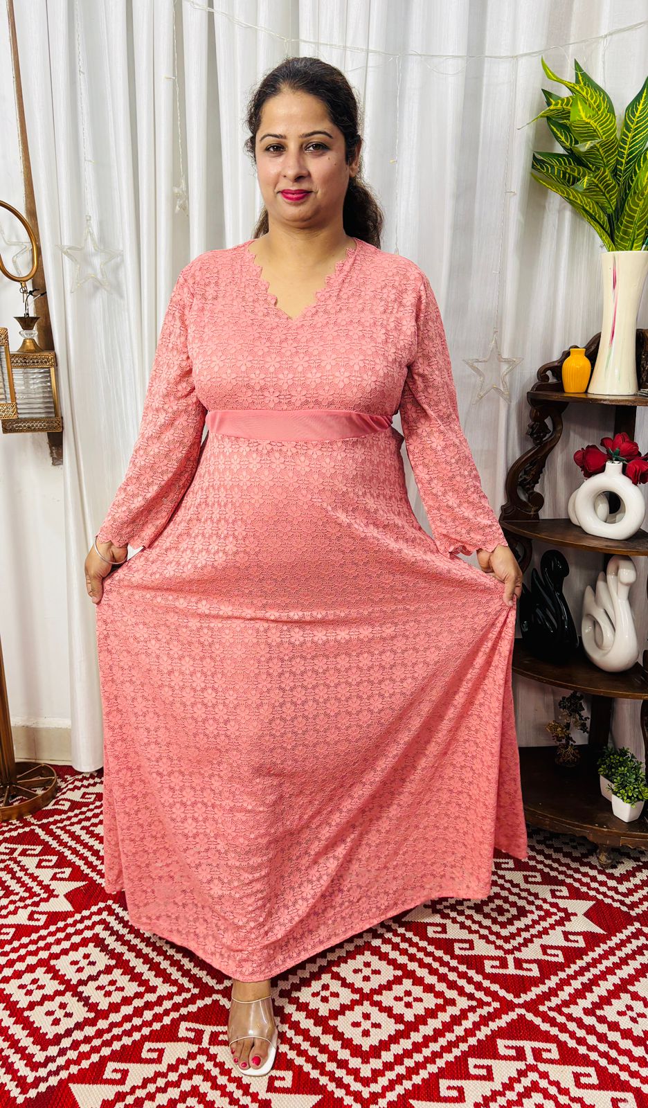 This is elegance with this stunning lace long dress. Designed with a flattering V-neckline and long sheer sleeves, this dress combines classic charm with modern sophistication. The intricate lace overlay adds texture and grace, while the fitted waist and flowing skirt create a beautiful silhouette that moves effortlessly with you. Ideal for festive occasions, evening events, or formal gatherings, this dress is a statement of refined style.