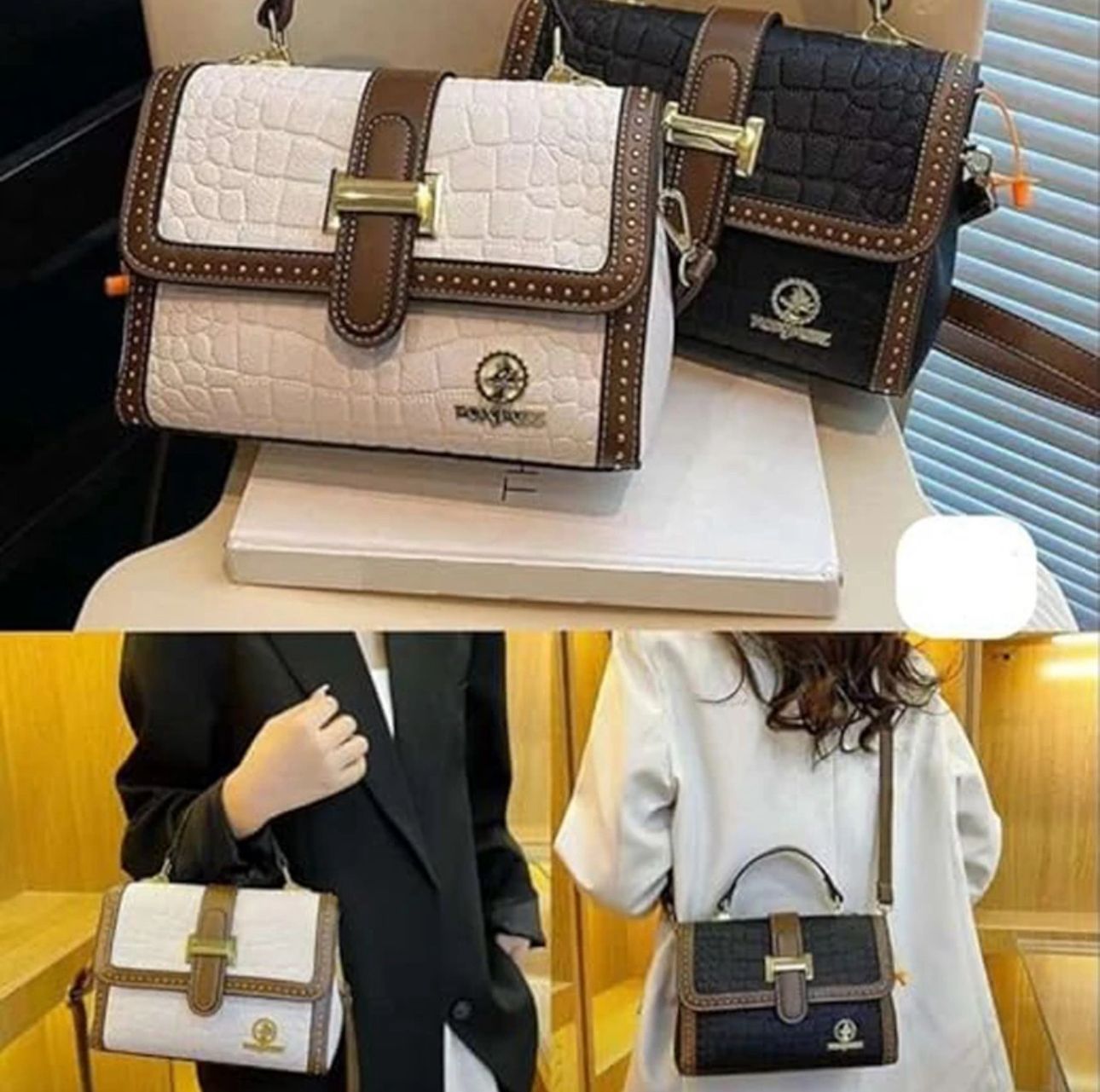 Textured faux leather | Dual carry (handle + sling) | Gold buckle closure | 3-pocket interior | Free sizeÂ