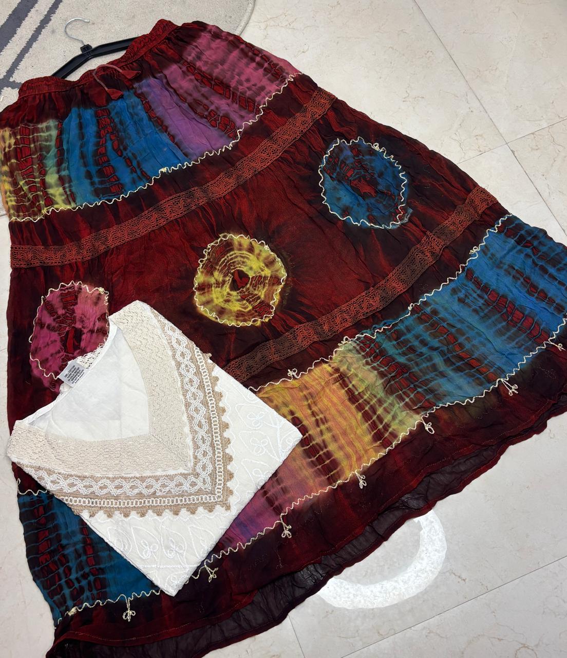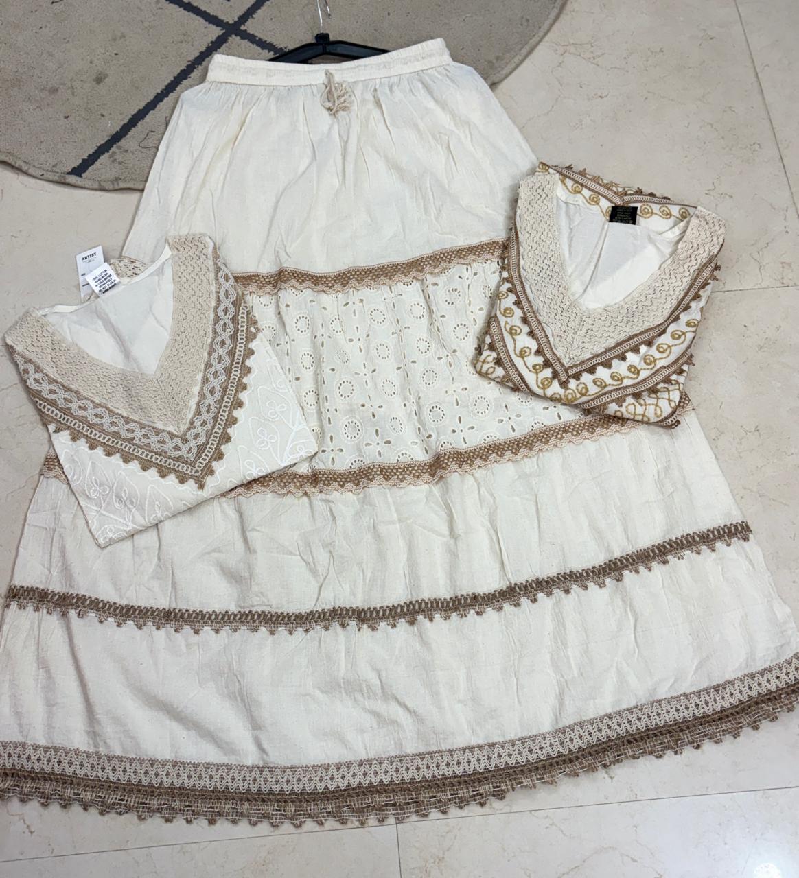 A skirt is a lower-body garment that typically hangs from the waist and flows down to varying lengths these beautifully crafted cream tops, each adorned with intricate cocoa-brown embroidery that celebrates artisanal finesse It can be designed in a wide range of styles, fabrics, and silhouettes to suit different occasions and body types.