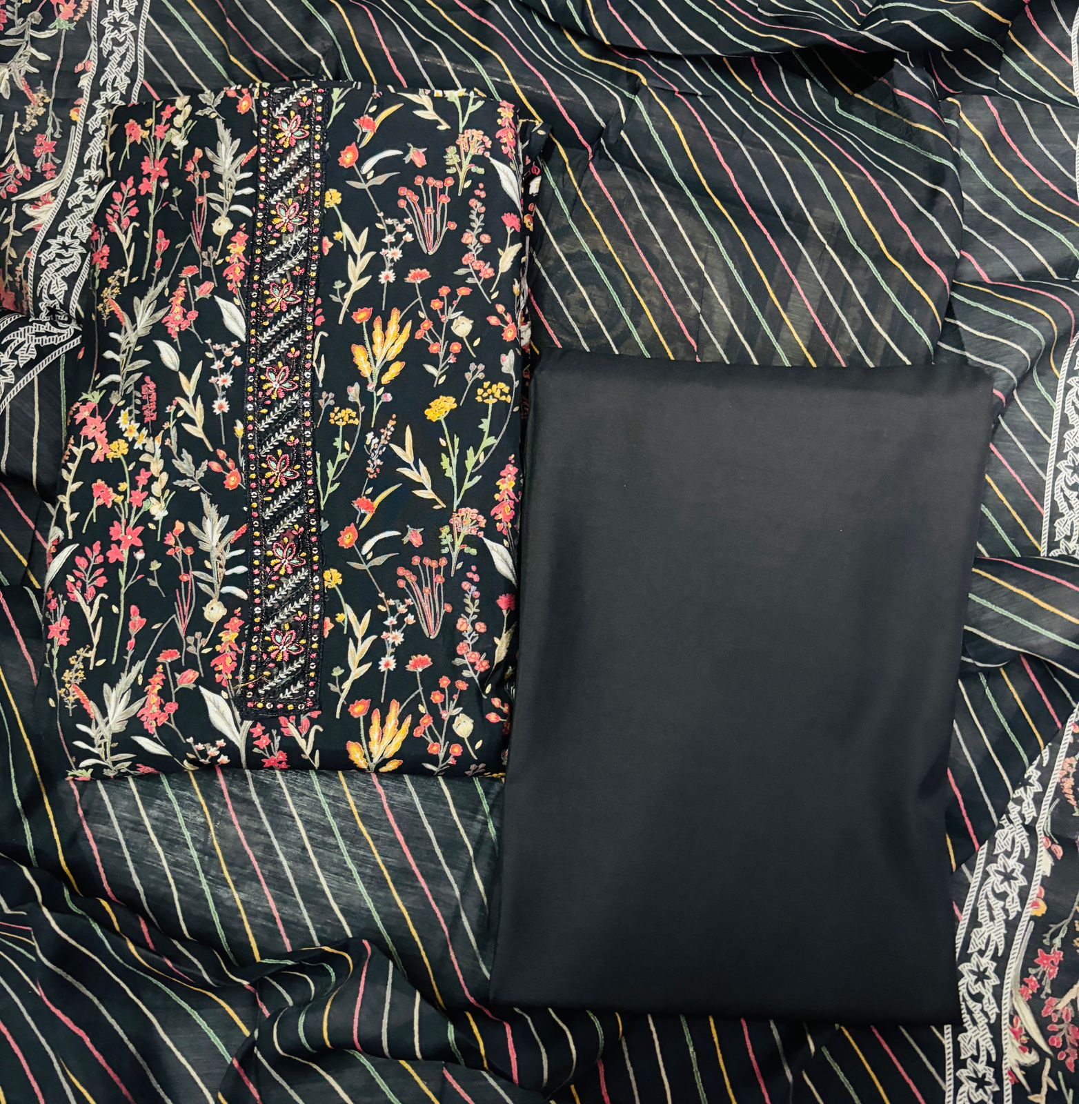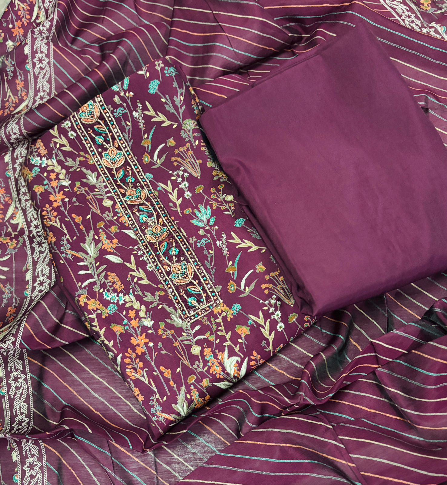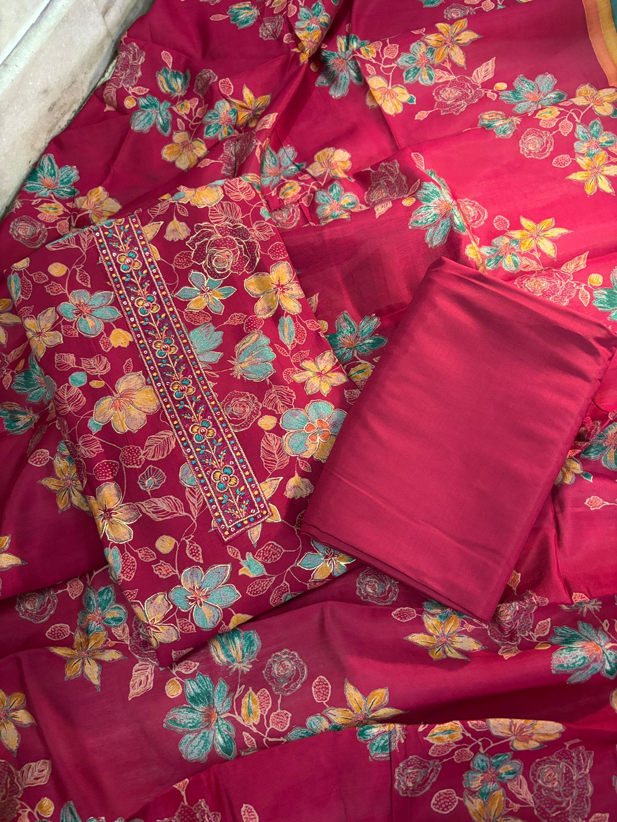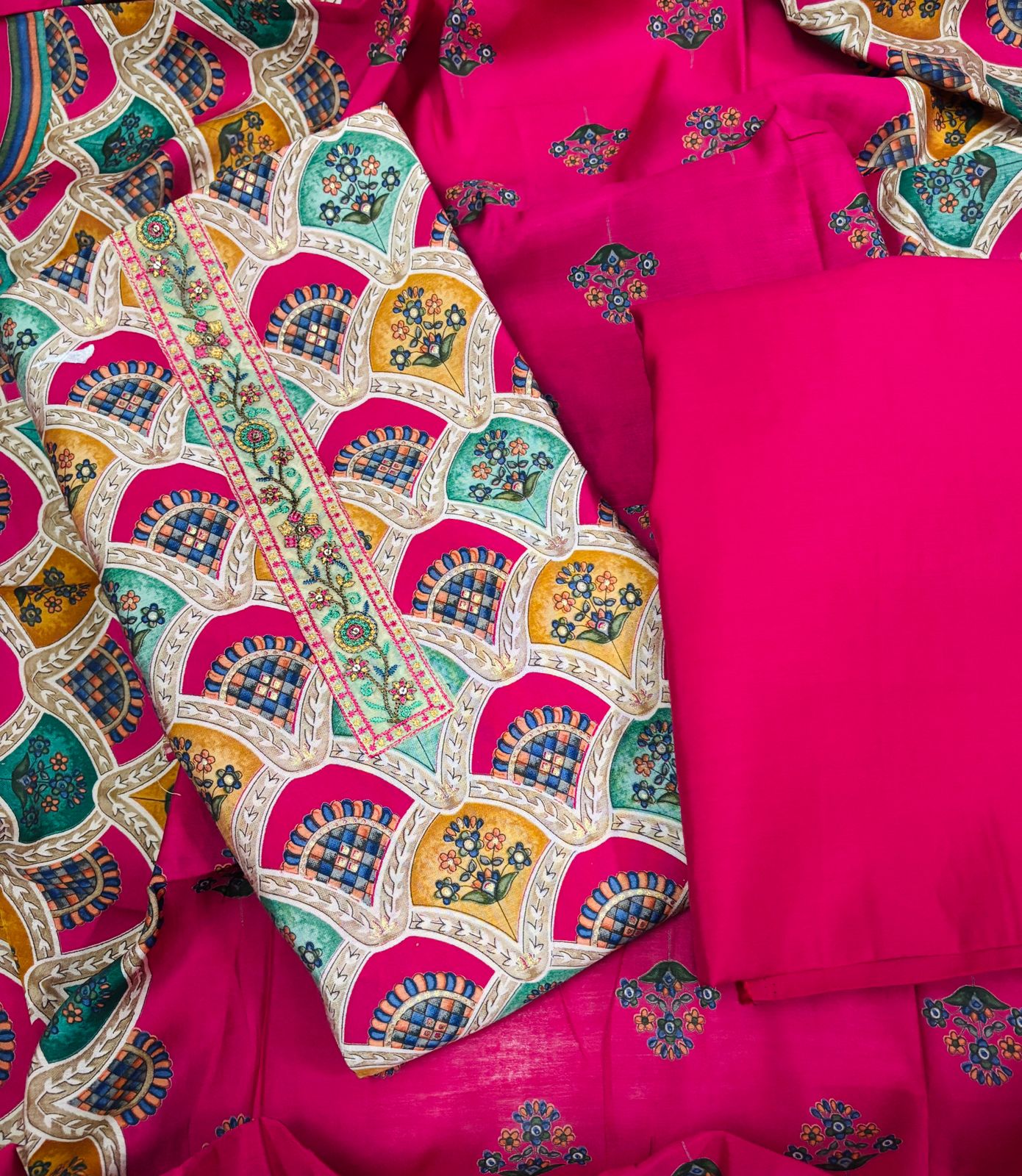 A symphony of tradition and trend 🌸. This vibrant ensemble features a statement front panel adorned with fan-shaped motifs in mustard, green, and sapphire blue—each bloom framed by delicate florals and a handcrafted placket with embroidery and buttons. Paired with solid magenta bottoms and a matching dupatta, the set offers a bold yet graceful silhouette.