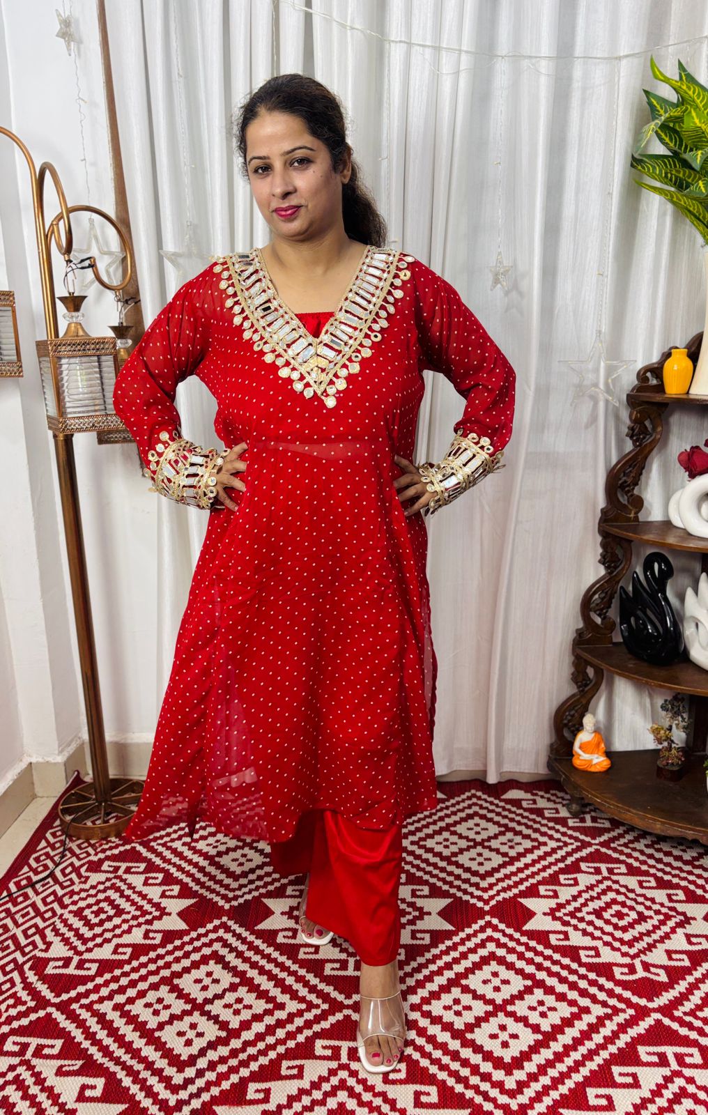 This is tradition in this beautifully crafted coord set. Adorned with delicate white polka dots and rich golden embroidery, this outfit blends classic charm with festive flair. The V-neckline and wide embroidered cuffs feature intricate mirror work, adding a touch of sparkle to your look. Paired with matching straight-cut pants, this ensemble is perfect for cultural celebrations, family gatherings, or festive evenings.