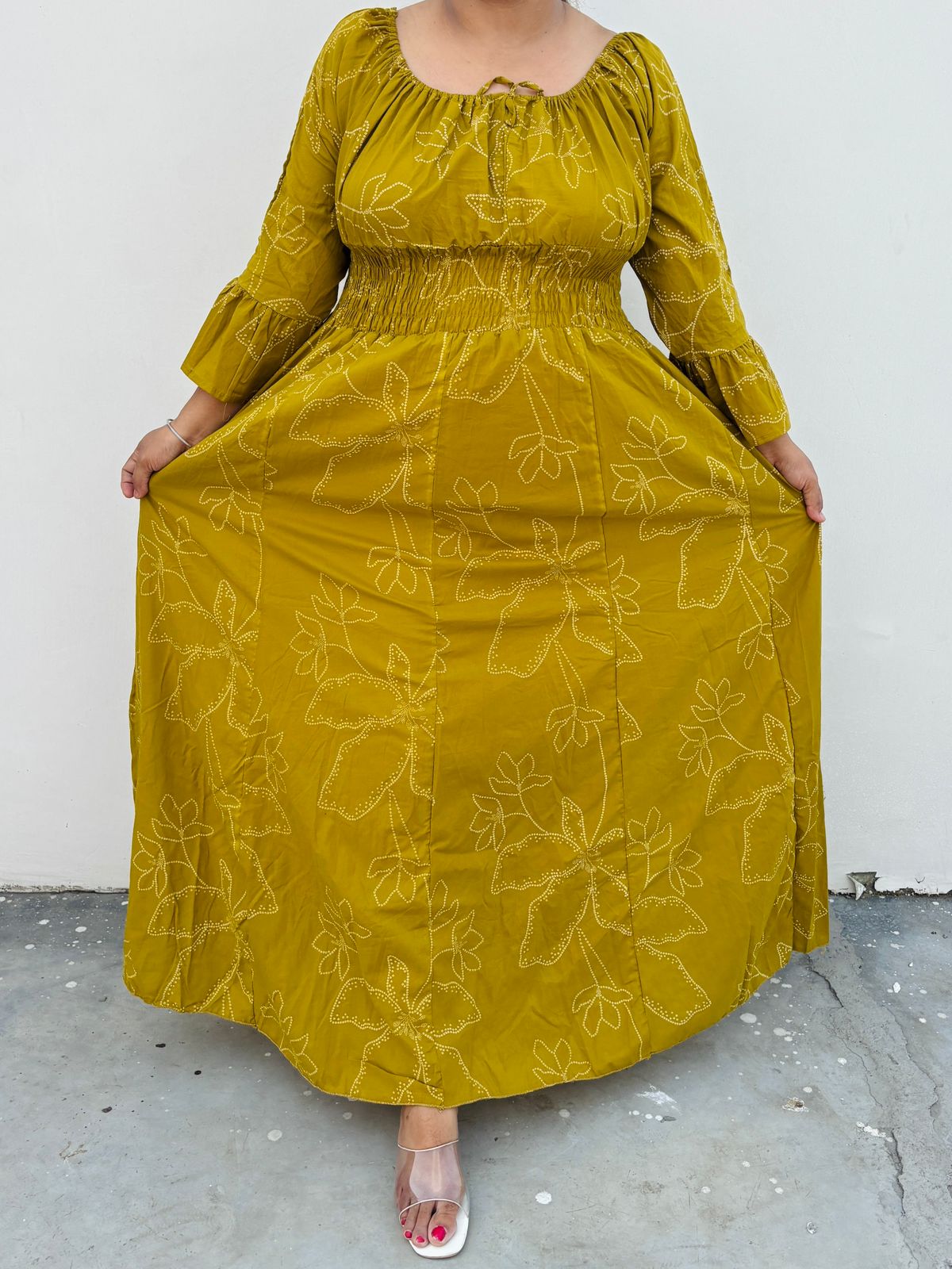 Step into effortless elegance with this maxi dress, designed to flatter and flow. Crafted from lightweight fabric, it features a delicate white floral and dotted pattern that adds charm and character. The gathered waist creates a cinched silhouette, while the long sleeves offer graceful coverage with a soft puff at the cuffs.