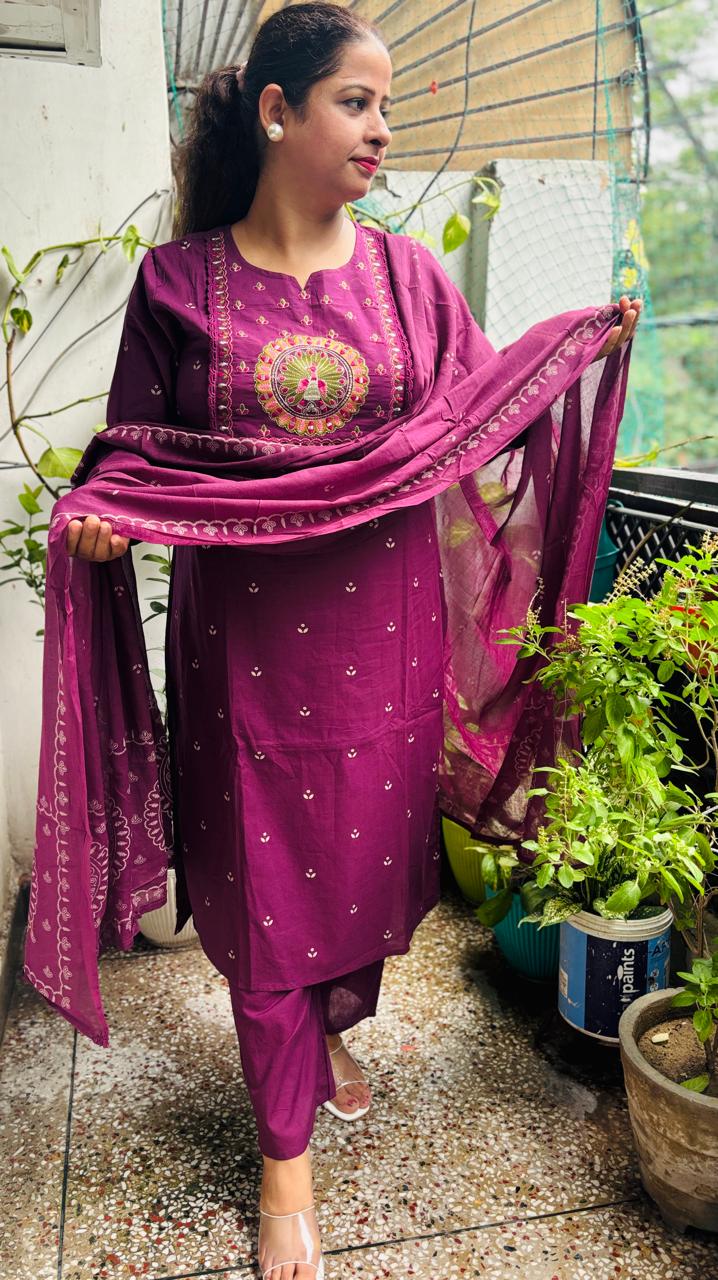 Features a straight-cut kurta with intricate mirror and thread embroidery, paired with solid tapered pants and a soft printed dupatta.